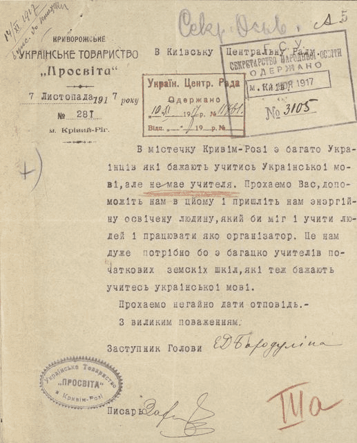 Для вивчення української мови, криворізьке товариство “Просвіта” у 1917 році надіслало документ до Центральної Ради з проханням знайти та відправити до Кривого Рогу викладача української мови. Про це писали у історичній спільноті “Криворізька старовина”.