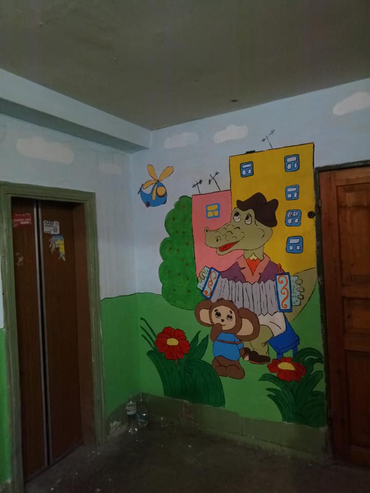 «Донька моєї подруги нещодавно народила дитину. Батьки дівчинки вирішили оздобити стіни парадної малюнками і запросили мене розмалювати їх. Сам будинок в хорошому стані, але стіни трохи обшарпані. 7 днів я розмальовувала їх. Вийшло яскраво і цікаво. Зараз це найкрасивіший під’їзд у будинку», – говорить художниця-поетеса.